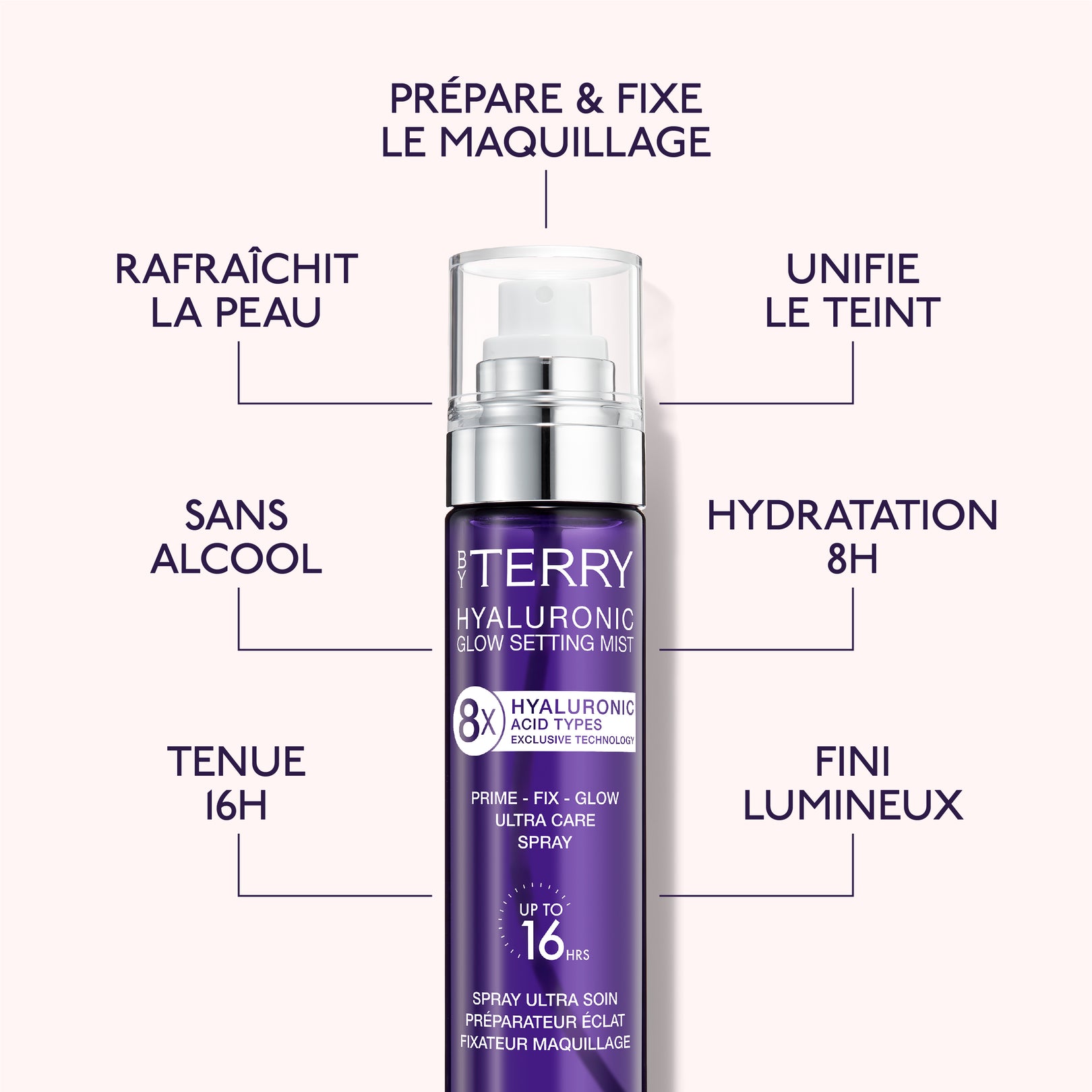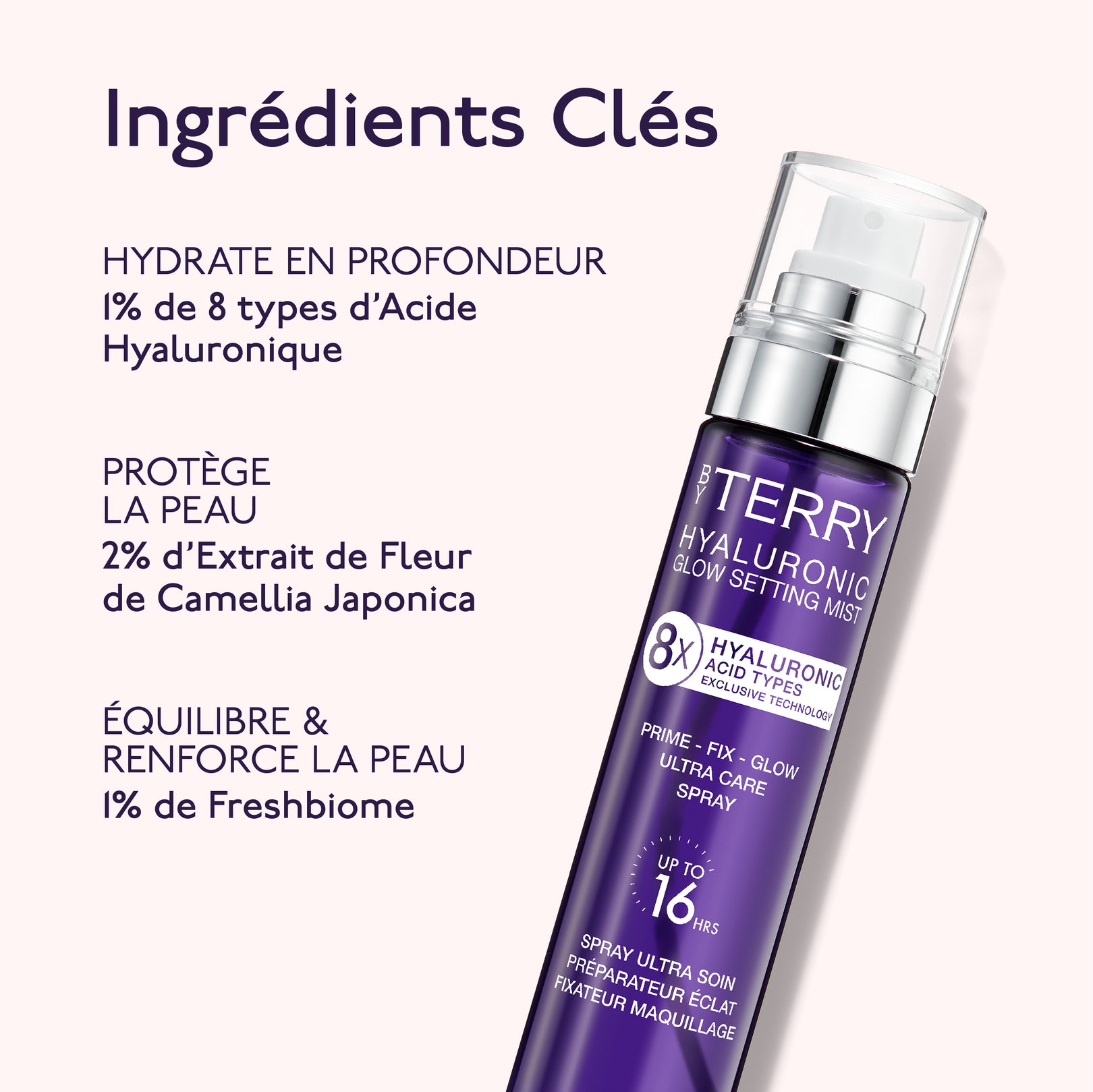 HYALURONIC GLOW SETTING MIST (10ml) : Cette brume fine multifonctionnelle hydrate la peau jusqu'à 8 heures*, prépare et fixe le maquillage jusqu'à 16 heures* pour le rendre résistant aux transferts et au maculage. Sa formule enrichie en soins comprend notre technologie exclusive de 8 Acides Hyaluroniques différents avec un complexe protecteur unique d'Extrait de Fleur de Camellia Japonica, de Céramides et de Probiotiques qui aident à protéger contre les agressions externes** pour une peau saine et impeccable. Sa formule non grasse et facilement absorbée offre une hydratation instantanée à votre peau. Le niveau d'hydratation de la peau est boosté de +103% dès la 1ère application*. Sans alcool et sans parfum. Convient à tous les types de peau. Bouteille en Plastique 100% Recyclable.