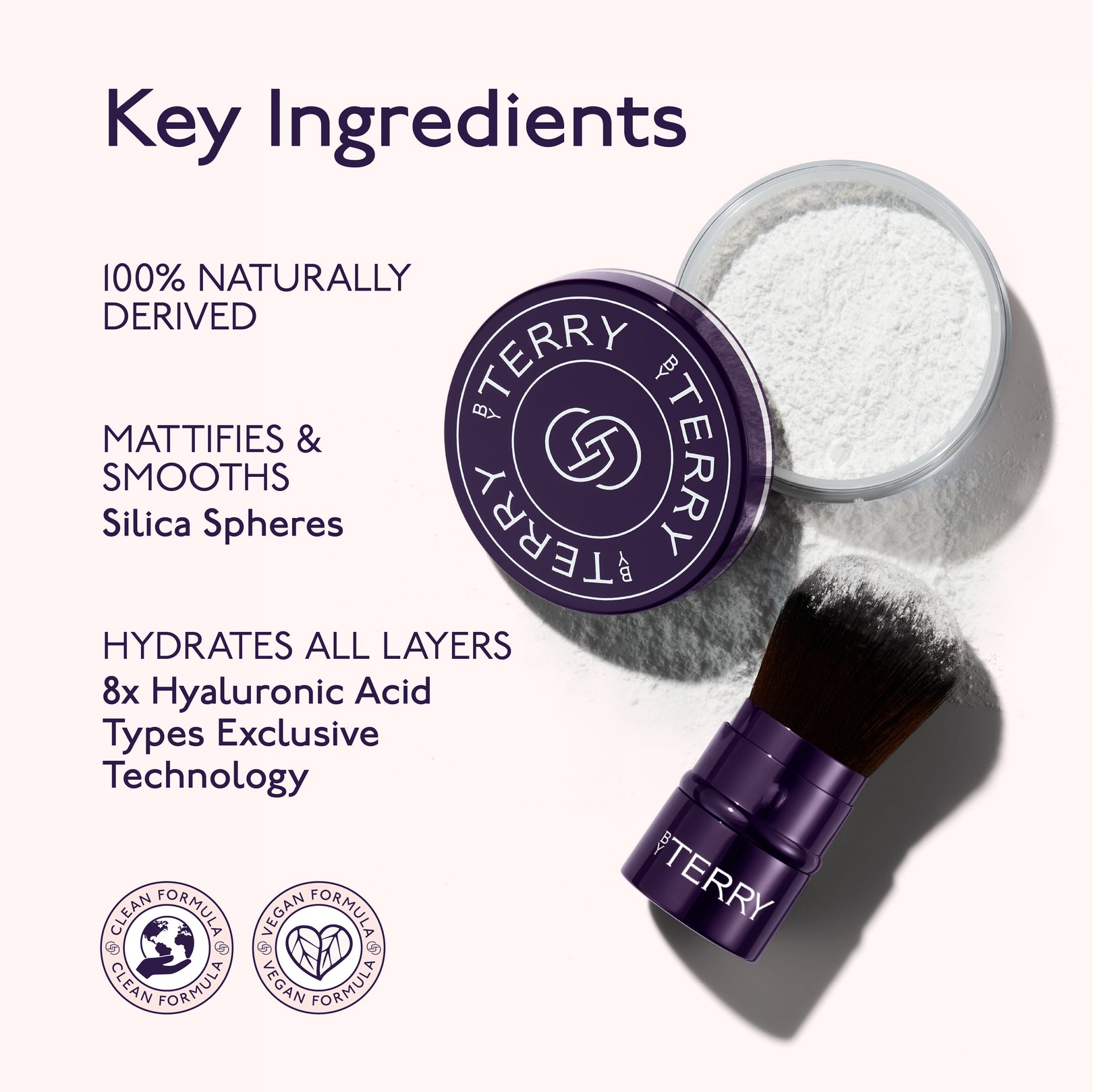 Skincare-infused loose setting powder. Instantly mattifies and blurs imperfections. Translucent. Non-drying. Contains 8x hyaluronic acid types. 100% natural origin, clean and vegan formula.