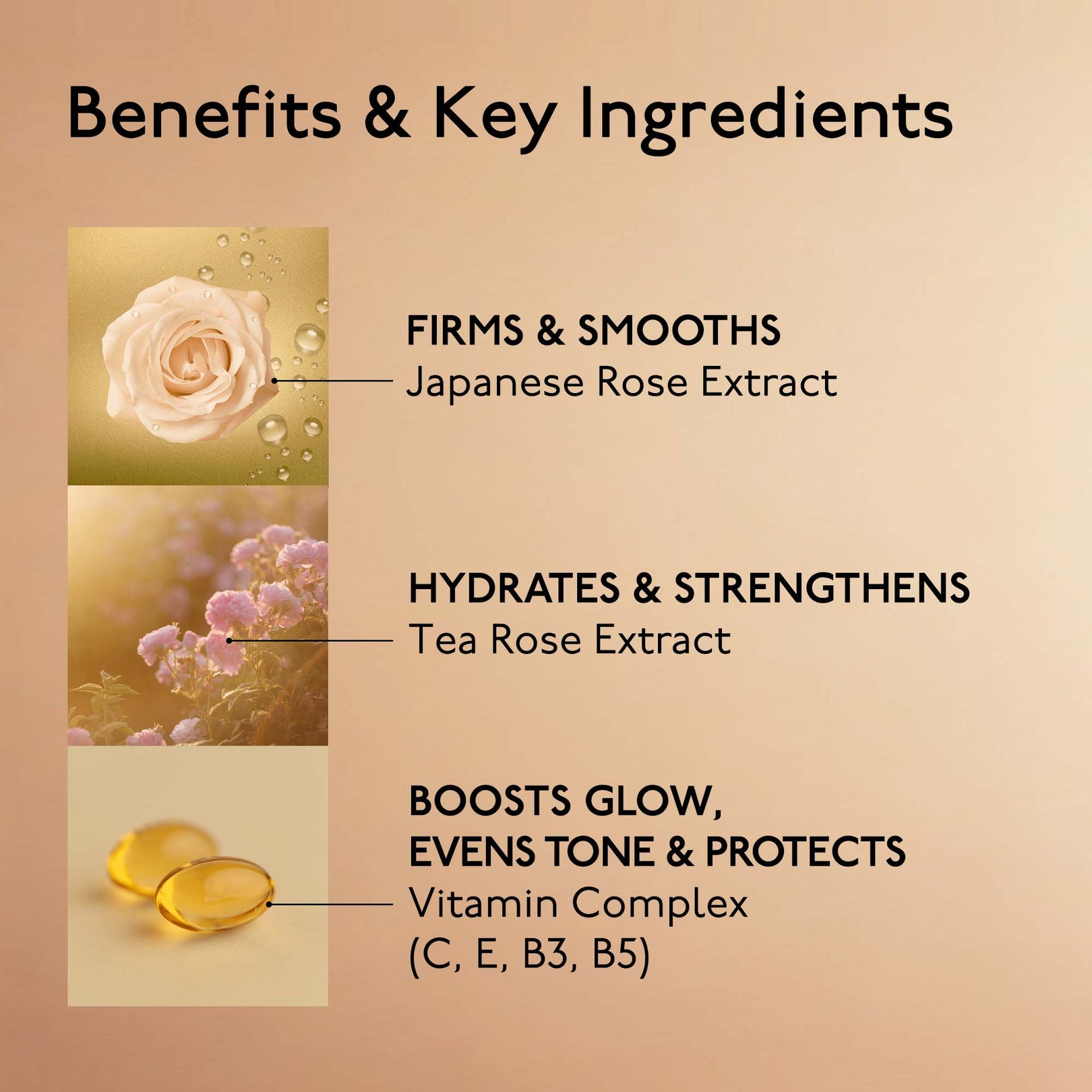 At the heart of the formula, Japanese Rose Extract rejuvenates, smooths, and firms the skin, while Tea Rose Extract hydrates, soothes, and strengthens the skin barrier. A 4-Vitamin Complex (C, E, B3, B5) boosts glow, evens tone, and protects the skin from external aggressors.