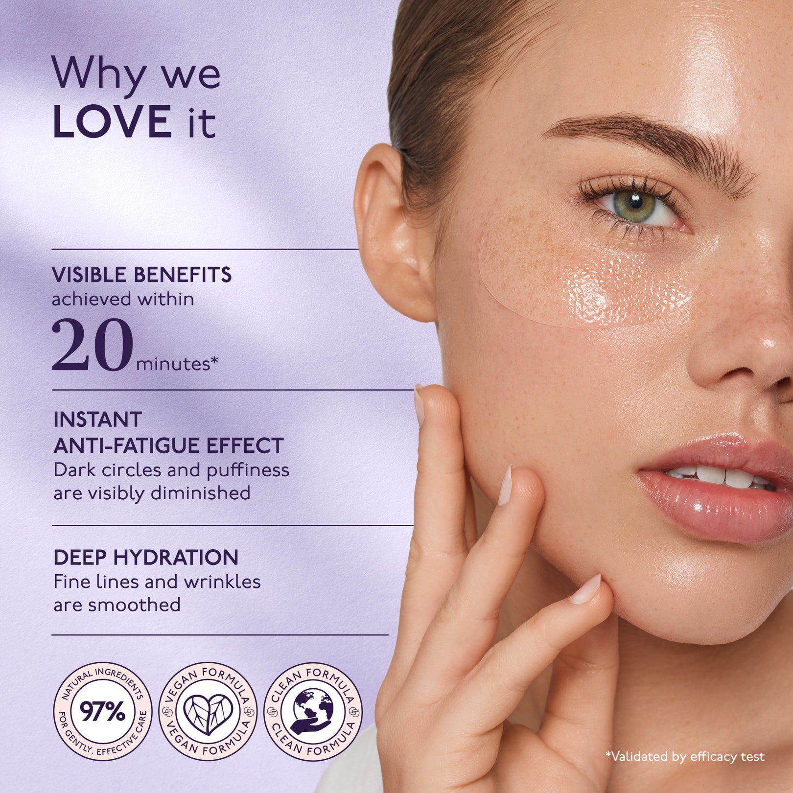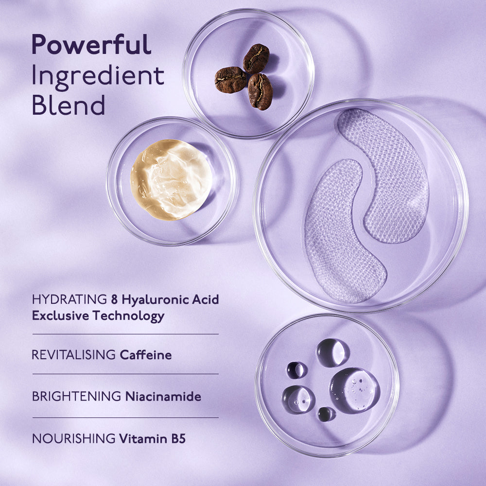 HYALURONIC FLASH EYE PATCH (x 1): Our ultra-hydrating eye patches, infused with hyaluronic acid, are your secret weapon for transformed eyes. With immediate action, they reduce dark circles and puffiness, smooth fine lines and wrinkles, and brighten the eye area in just 20 minutes. Infused with a serum containing 97% natural ingredients, our patches are concentrated with actives that work in synergy for radiant eyes. Designed for single use to deliver an immediate pick-me-up before a big day, or for visible results day after day.